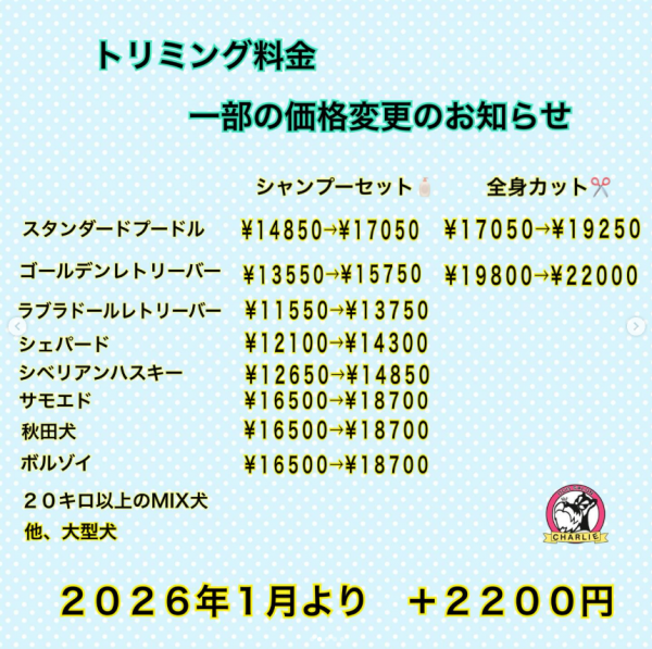 おかげさまで20年目を迎えたチャーリーですが、小型・大型犬の種類を問わないデザインカットや、